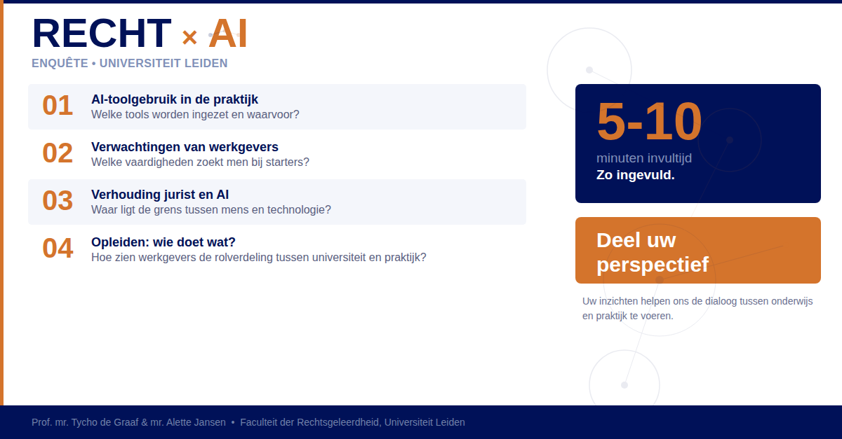 Vind je het ook zo belangrijk dat de rechtenstudie en praktijk goed op elkaar blijven aansluiten? Twee onderzoekers van de Leidse rechtenfaculteit, prof. mr. Tycho de Graaf en mr. Alette Jansen, onderzoeken welke AI-vaardigheden de juridische praktijk (waaronder het bedrijfsleven) verwacht van startende juristen. De resultaten worden in een wetenschappelijk artikel gepubliceerd en kunnen bijdragen aan een betere aansluiting tussen de universitaire opleiding en de praktijk. Zij vragen 5-10 minuten van uw tijd om deze enquête in te vullen. |